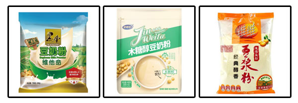 星格袋裝豆奶粉包裝流水線設(shè)備樣品效果圖